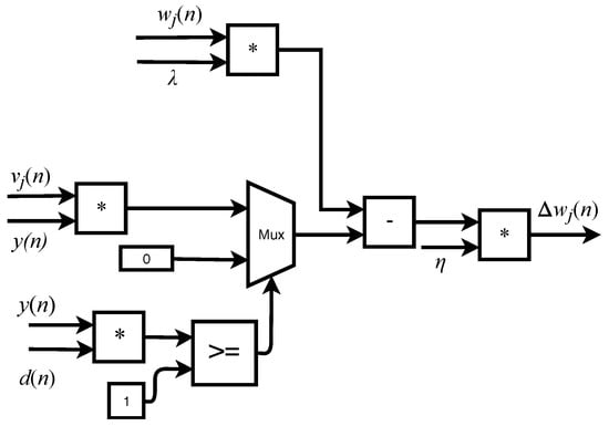 where is the neural weight associated with the j-th input, and the SVM output in the n-th iteration. The implementation of this equation in the FPGA is shown by Figure 4. For this to happen the entries are multiplied in parallel by their corresponding weights , the result is then summed using a tree adder.