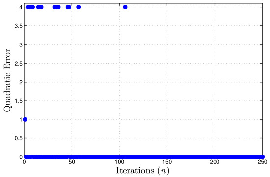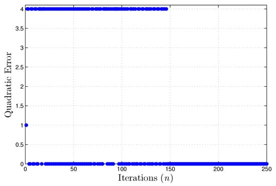 Two datasets were used to validate the hardware design. The first was the XOR gate, being the SVM used to draw the ideal decision surface that divides the two classes correctly. In this design, the value of each j-th input, , in the n-th instant (or iteration), corresponds to the input of the XOR gate and the output of the circuit.