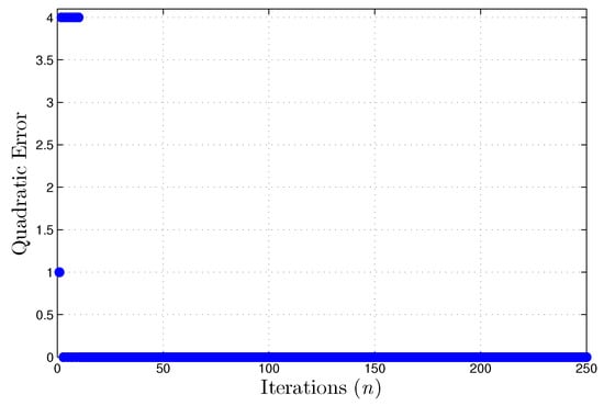 As for the correctness of the implementation in hardware, it can be seen through Figure 7 that the implementation converges in few iterations. Being the vertical axis is the value of the instantaneous quadratic error and the horizontal the number of iterations.