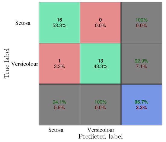 For the test samples retrieved from the Iris dataset the confusion matrix is presented on Figure 10. From the total of 30 samples, 16 were classified correctly as Setosa, amounting for of all samples. From the Versicolour class 13 samples are correctly classified, corresponding to of the samples. For this dataset of the classes were correctly classified.