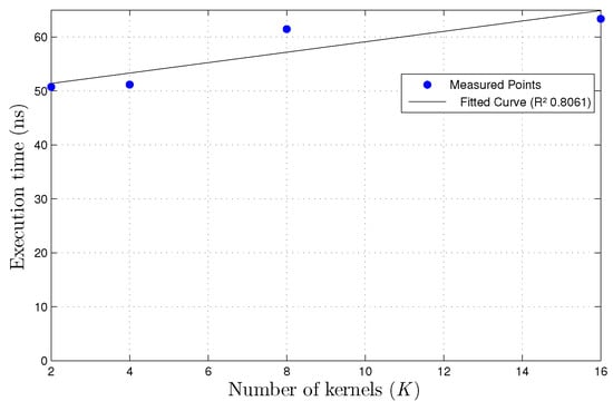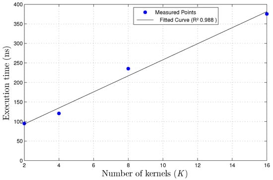 Although it was not possible to synthesize the design for a dataset with more than 4 features to compare with the state of the art, the results from the current datasets were extrapolated using a linear regression. The extrapolation was performed using data from the XOR dataset on both fixed and single precision floating point, as well as from Iris dataset using single precision floating point. The regressor has as input the number of kernels and as output the execution time. In order to compare to a model with 758 inputs, for example, the input of our regressor was 758, then the output was compared with the execution time of the model being referenced. Despite the fact that is not necessarily the case to have one kernel for each input, this draws a lower bound on our results. Further studies can show that the actual performance is different from the results presented in this work. As presented on Figure 12 the linear regression of the xor dataset using floating-point precision had a score of , with sample time, , computed as