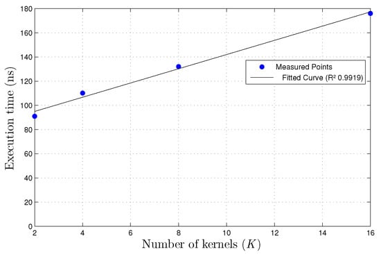 Linear regression curve for execution time per sample for varing numbers of kernels k, XOR dataset fixed-point precision.