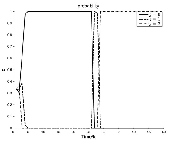 One can see from Theorem 3 that is a constant, whose value only affects the convergence speed of the a posteriori probability and does not affect the convergence. That is, after the time k, no matter whether the system mode changes, the a posteriori probability of the real system will always tend to 1, and a posteriori probability of the non-real system will tend to 0.