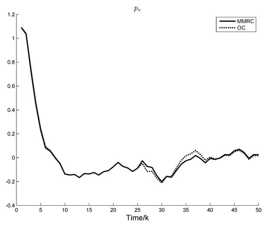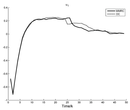 Figure 2 and Figure 3 demonstrate that, in the first stage, MMRC follows closely OC except for the initial transient period. When fault occurs in the system in the second stage, a certain error lasts for a while, but then MMRC fluctuates around OC and eventually MMRC follows closely OC. It is observed in Figure 4 that, in the first stage, there is only a slight difference in the state response curves under OC and MMRC, and, in the second stage, there is a deviation. However, the state response curve of MMRC finally follows closely that of OC in the control horizon.