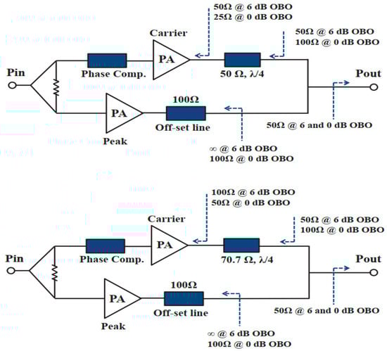 In [52], the combiner section was simplified by matching both amplifiers to 70 Ω as illustrated in Figure 13, at the same time, the load impedance was still 50 Ω, in this case, however, a mismatch between the load and the matching networks will be introduced (−15 dB return loss) in the cost of simplifying the combiner. Further work of reconfigurable as well as concurrent dual-band DPAs was described by [53] where the reconfigurability had been achieved by using switches.