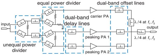 Furthermore, dual-band three stage DPA was designed by [30]. The design was targeting 1.7 GHz and 2.4 GHz using three devices of 10 W Cree transistors so that 9 dB back-off can be achieved; the for the main, auxiliary 1 and auxiliary 2 power amplifier are 100 Ω, 50 Ω, and 50 Ω respectively. The phase offset lines and the quarter wave transformer are designed and realized using Π-type. The designed PA was tested using wideband code division multiple access (WCDMA) and worldwide interoperability for microwave access (WiMAX) signals with 7 dB PAPR, where WCDMA signal had a bandwidth of 3.5 MHz and the WiMAX had a 5 MHz bandwidth. DPD was used to improve the linearity of the system.