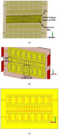 Proposed 1 × 2 array antenna based on MTM-LWA using SIW technology. (a) Top view; (b) view to show the Substrate integrated waveguide slots; (c) back side to show the ground plane.