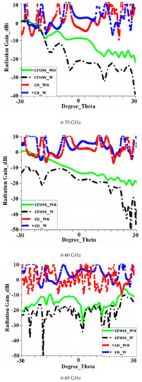 Radiation patterns of the proposed antenna arrays with no and with MTM-shield through its operational bandwidth at spot frequencies of 55 GHz, 60 GHz & 65 GHz are plotted in Figure 6. It is clear from this figure that with the shield the cross-polarized radiation over its operating range is substantially reduced. The average gain of the co-polarized radiation is only marginally affected. All details are tabulated in Table 2.