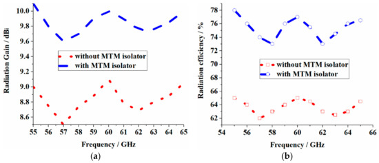 In addition, the radiation gain and efficiency curves over frequency bandwidth for both antennas without and with the proposed shield are shown in Figure 7. Obviously, after realizing the metamaterial shield based on SIW, the radiation gain and efficiency performances improved by ~1dBi and ~13% on average, respectively.
