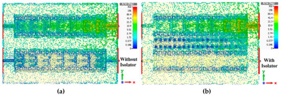 Surface current density distributions without and with the metamaterial shield at 60 GHz. (a) without the metamaterial shield; (b) with the metamaterial shield.