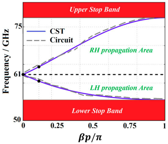 Dispersion diagrams for the proposed LWA array based on SIW-MTM extracted by CST Microwave Studio package and the corresponding equivalent circuit shown in Figure 9b.