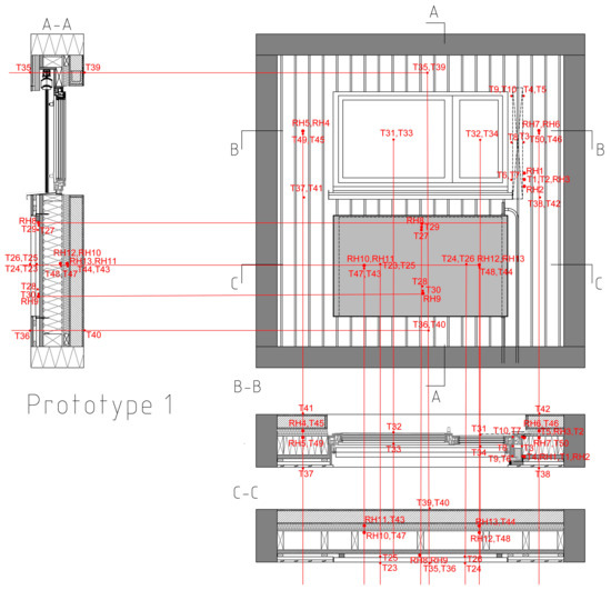 As the sensors were new, and never used before, they were tested during a laboratory experiment to measure Temperature and Relative Humidity of a multi-functional façade. This activity was needed to test the accuracy of sensors and the performance of the electronic filters to acquire signals. This experiment was done in the EURAC’s guarded hot box facility called INTENT (Integrated Envelope Testing facility), compliant to [42] and [43]. In the hot box, these sensors were placed on the internal and external surface of the façade, placing them along the same horizontal axis be in the same position on the external and internal façade, but near the left and right border on every facade. In this configuration, a similar value for the sensor on the same façade was expected. This value is not exactly the same because of the uncertainty of the climatic chamber in terms of temperature and relative humidity uniformity measured by the sensors on the same façade (Figure 3).