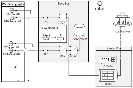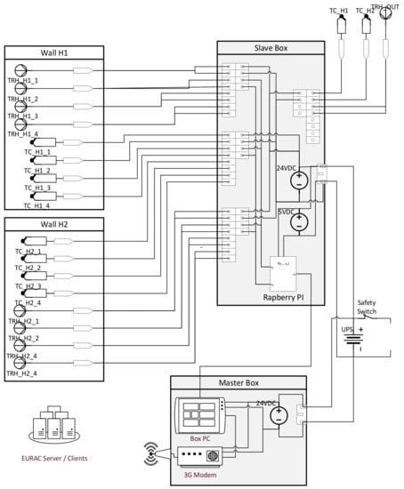 The General Architecture of the acquisition system is based on a Master Slave configuration (Figure 4). These components are installed in two different boxes and the communication between them uses a Modbus over TCP/IP protocol. Master is dedicated to high level task management, and communicates with Slave to acquire and to visualize measurement data in online mode, as well as to visualize saved data in offline mode. The selected sensors are wired, and therefore, more difficult to be used in historic buildings. Here, this problem was reduced using wireless data communication between sensors and data logger to avoid long wires. To solve the problems of data communication between the data logger and remote clients, a 3G modem was selected to avoid connection using Ethernet cable, with the need of holes and nails along the walls, or Wi-Fi communication with the possibility of signal loss, due to thick walls.