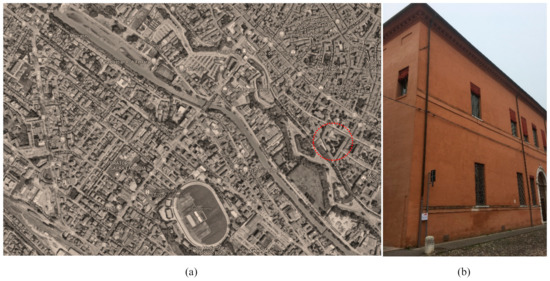 (a) Site plan of the Palazzo Tassoni Estense (Google Maps (2019)); (b) façade of the Palazzo Tassoni Estense (photo by M. Calzolari).