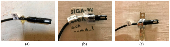 Mounting systems are necessary to favor the heat exchange and to ensure the thermal equilibrium between surfaces and sensors. Commonly used mounting systems are: (i) Adhesive like glues and bonds; (ii) tapes; (iii) thermal conductivity paste in combination with tapes, bonds, or nails; (iv) screws, nails, or holders also additionally combined with glues, tapes, or thermal conductivity paste [11]. Unavoidably, conventional mounting procedures and systems can damage valuable historic surfaces and often leave residues of materials with unknown aging behavior [11]. Thus, contact monitoring in CH needs caution and adequate procedures to not create damage or mechanical stress to the surface. Historic surfaces require the use of low adhesive or non-destructive mounting systems, such as: (i) Thermoplastic resins; (ii) volatile binding media (VBM) and solvents; and (iii) dry mounting systems. The Fraunhofer Instituts für Bauphysik (IBP) verified the applicability of different thermoplastic resins (such as epoxy resin, hot-melt adhesive, volatile binder system, fugitive binder, Japanese Paper and hot-melt adhesive) with a sensible paint layer composed according to a historic recipe [11]. None of these thermoplastic resins resulted completely free from the risk of damage, but they proved clean looking, simple, and durable only when were used with care [11]. Otherwise, thermal stress and plasticizer migration occurred for powdery suraces, causing irreversible damages [9]. Weak and sandy historic surfaces needed an additional fixture with nails to improve the heat transfer contact [9,10].