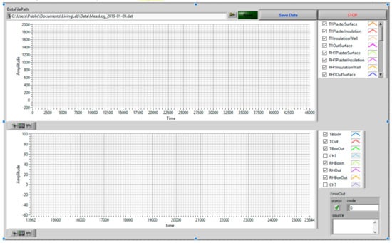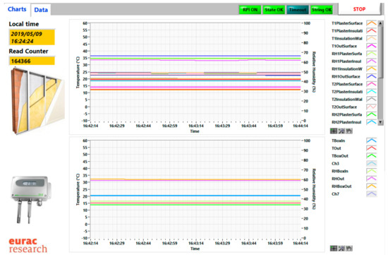 To have suitable thermal data, a temperature difference of 20 K was guaranteed between the indoor and the outdoor environment. Generally, the hygrothermal parameters shall be monitored continually for 12 months to determine the fluctuations of the natural or historic microclimate in order to identify the possible damage of CH, due to the impact of environmental conditions [8,9,24,25,26,27,28,29,30,31,32]. Time step recording of these parameters changes according to each case studies and final objective of the research. Herein, the default acquisition time period was set to 60 s. DAQ (data acquisition) system stores continuously data on local files with a user defined frequency.