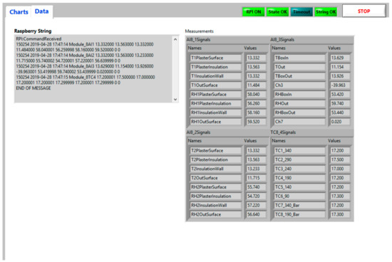 Moreover, an NTP (Network Time Protocol) client is enabled to retrieve time information from an NTP server running on panel PC. Data acquisition from measurement modules is based on a C/C++ software running as a daemon on each RPIs. DAQ software is interfaced to the measurements modules with ModbusRTU protocol [48] implemented with modbus library developed for Raspberry system [49]. The software also detects and stores the heating system status through a simple coupling circuit interfaced to a GPIO RPI input. The DAQ software has no graphical interface and it runs a multi-client TCP/IP server, which allows external connection to interact with the DAQ system. With base TCP/IP commands, users can enable/disable the continuous data store on local files, set the continuous acquisition time period, get the status of DAQ system and get direct data from the measurement modules. In order to allow DAQ system to restart with last user defined settings (enabled/disabled continuous data store and acquisition time period), setup is stored in a local file and the information is retrieved when the daemon starts. For debug operation, other user-expert TCP/IP commands are implemented, which allow to read/write the defined Modbus registers of the measurement modules. DAQ software can also be compiled to interface with a user through command line input, but for the normal running mode, this feature is disabled. By default, DAQ system is configured to store continuously data on local files and a graphical data display runs on the panel PC, which can reach by remote connection.