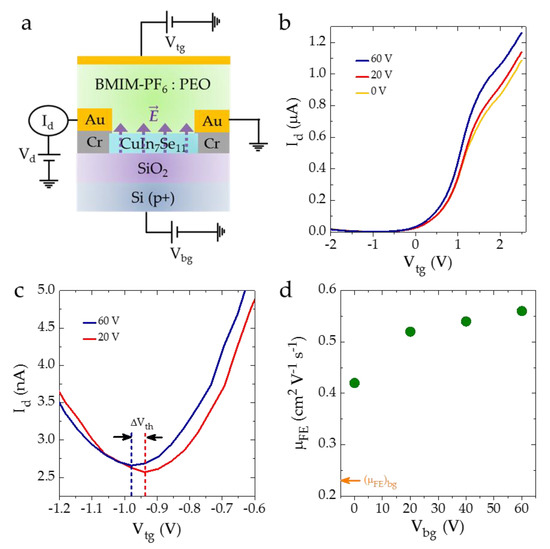 Multiple gates in FETs can lead to versatility in the application where properties due to one gate can be modulated by other gates [48,49,50]. Several past investigations have shown that a great level of tunability in device properties can be achieved through a top and bottom dual gate geometry [16,51,52]. For example, an investigation of bilayer graphene with dual (top and bottom) gating indicates an opening of the band gap as well as improvement in general electronic transport behavior due to the screening of disorder potential [52]. In order to test such effects for CuIn7Se11 FETs, we investigated one such device in dual gate operation mode with a SiO2 dielectric back gate and a BMIM-PF6: PEO ion-gel top gate. Figure 4a shows the schematic of a dual gate FET. Figure 4b shows forward cycle of transfer characteristics for the ion-gel top gate with different back gate voltages. It is to be noted that the on-state current was increased upon application of the back gate voltage. Particularly, on-state Id at Vtg = +2.5 V was increased from ~1.08 μA at Vbg = 0 V to ~1.26 μA at Vbg = 60 V which is an almost 1.16 times increase. Dual gating enables an estimation of EDL capacitance of ion-gel by interconnection between the SiO2 back gate and the ion-gel top gate [16]. In dual gating FETs, the application of back gate voltage will change the threshold voltage of the top gate [16]. EDL capacitance was estimated from the change in the threshold voltage (ΔVth) in response to the change in the back gate voltage (ΔVbg) by using Equation (4) [16]: