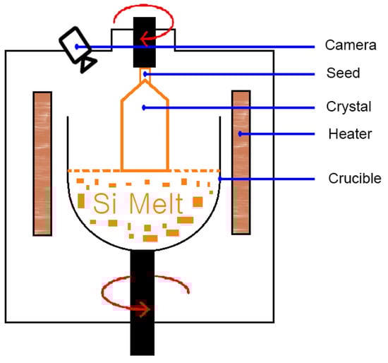 The CZ technique begins when the feed material is placed into the cylindrically-shaped graphite–quartz crucible and melted using a carbon heater. After material is molten, a few-millimeter-sized silicon seed is dipped from the top into the free melt surface and the melt meniscus is formed. After the remelting of a small portion of the dipped seed, the seed is slowly withdrawn from the melt with rotational force and the melt crystallizes at the interface of the seed, forming a new crystal portion. The crystal growth process was captured by a camera located at the top of the chamber, as shown in Figure 1. Since 1917, many designs have been developed to optimize the CZ, such as increasing the growth velocity to control the shape of the resulting bulk crystal [3], and dislocation-free growth by Teal and Little [4]. Then in 1975, Digges et al. introduced an optical sensing of the bright ring for automatic diameter control that indirectly measures the crystal diameter with rapid cooling methods [5]. In the 1990, Itsumi et al. applied octahedron structures for SiO2 using transmission electron microscopy and energy-dispersive x-ray spectroscopy [6]. An approach using 3D model from a transverse magnetic field in CZ furnace for predicting value of silicon growth rate with a pulling rate, rotation rate, and thermal gradients was also developed [7]. Moreover, to meet the demands of the next generation of the industry, computer science, biology, and chemistry must be integrated to develop unique solutions for complex problems. Many studies have been published regarding the application of computer science to this procedure. For example, Winkler et al. used a mathematic algorithm to calculate the crystal diameter and introduce the automatic CZ process with a nonlinear-state smart sensor, or soft sensor, or virtual sensor for controlling the quantities in the Czochralski crystal growth [8,9]. Jing et al. used a 3D-simulation method for investigating the relationship among the melting temperature at the melt or crystal surface, the rotation rate and efficiency of the final crystal product [10], and Kim et al. used an auto-seeding system and image processing technology to optimize the manufacturing of sapphire crystal growth via the Kyropoulos (KY) method [11]. Alternatively, a Malvern PVS system (Citrix Provisioning Services) was used to create 85 shape descriptors to analyze the crystal size and shape with the temperature and turbidity rate per minute [12,13]. Moreover, the aspect of crystal shape and quality also depends on the thermal gradient G managed by the thermal insulation and presence of the afterheater [14].