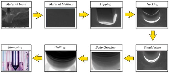 The CZ process begins with the material input step and ends with the removal (Figure 2). The most important thing is the dipping system, where the melting temperature and duration are extremely important. By applying this optimization method, good dipping images were detected with a high accuracy rate and the duration was calculated with very small errors. The first dataset recorded by CCD contained over 2 million images of 660 × 550 pixels. These images were preprocessed using several algorithms, including grayscale channel switching, threshold at specific value application, and median blur processing. Afterwards, the images were classified into two folders: Positive (approximately 11,000) and negative (approximately 90,000). These 90,000 images were obtained from different steps of CZ, such as material input and melting.