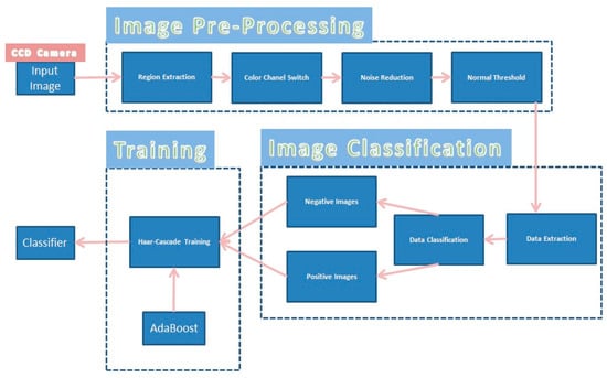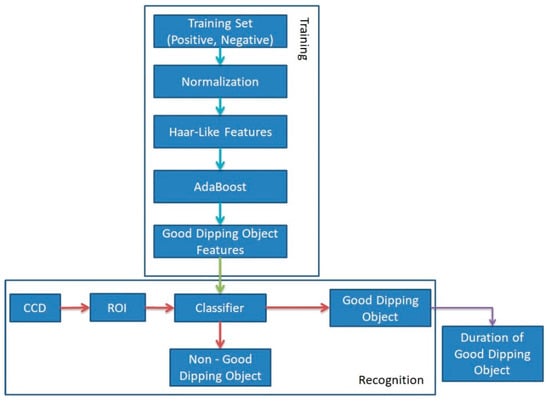 After the classification step, the two sets of images were used for the training step. In this step, the AdaBoost learning algorithm was used to increase the classification performance of the Haar-cascade classifier training [19,20]. AdaBoost contains a large number of examples that had a strong effect on the generalization performance of a strong classifier’s training error. This caused a small number of the images containing the need-to-find object to be misclassified. The AdaBoost algorithm simultaneously runs many learning steps. The purpose of the learning method was to construct a classifier for the recognition of good dipping images and ideal durations in the next step. This learning has many states that must be decided by the user. For each state, the computer creates a first classifier from the positive images and tests it on the negative images for evaluation and builds a second classifier featuring higher detection rates. The second classifier is subsequently used in the next states. This process ends when the last state is completed. The cascade stages are run by training the classifier tool using the AdaBoost algorithm and compiling with the threshold algorithm to minimize the error rate.