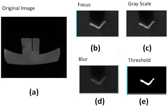 Images from the preprocessing step. (a) The original image; (b) images in the focusing step; (c) image in the grayscale channel; (d) image with the blur algorithm applied; (e) image with the binary threshold algorithm applied.
