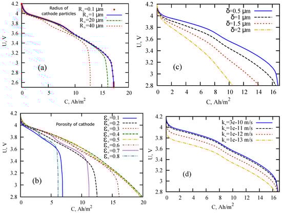 LIB discharge curves calculated within the SP model under normal diffusion conditions for the variation of different parameters: cathode particle radius (a), cathode porosity (b), solid-electrolyte interface (SEI) thickness (c), and electrochemical reaction rate in the anode (d). Other parameters are listed in Table 1, subdiffusion indexes are taken equal to one.