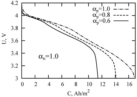 LIB discharge curves for the parameters specified in Table 1 and different values of the subdiffusion index in a cathode.