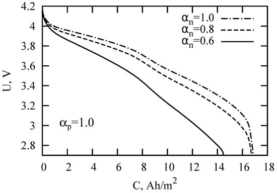 To assess the effect of anomalous diffusion on the discharge characteristics of LIB and impedance spectra, we consider the subdiffusive generalization of the single-particle (SP) model, which is a simplification of the pseudo-two-dimensional (P2D) model (Figure 1). The original P2D-model was developed in [1,28,29]. The segment on the x axis is considered to be divided into three sections corresponding to two electrodes and a separator. Newman and Tobias [30] showed that the current distribution in the porous electrode due to the electrochemical reaction is fairly uniform. The assumption about homogeneous current across the electrode thickness is a key point of the model. In the standard SP model, electrodes are modeled as two spherical particles, and the variations in electrolyte concentration and in potential are usually ignored. Although, there are generalizations (see, e.g., [31,32]), where these variations are taken into account. Here, we also consider changes in concentration and potential along the x -axis. Spread in particle sizes can be taken into account within the so-called multiple particle model (generalization of the SP model). Meyers et al. [33], combining the impedance of a spherical electrode particle with an electrolyte impedance, obtained an analytical expression for the impedance of a porous electrode under the assumption about the ohmic character of electrolyte impedance. In [34], the authors proposed the impedance model describing diffusion within the solid electrode particles, charge transfer, charging of the double layer, formation of a solid-electrolyte interface, and the concentration gradients inside the electrolyte. Guo et al. [31] studied the energy balance within the SP model and described the thermal behavior of LIB in the process of galvanostatic charge-discharge modes. Note that existing versions of the P2D and SP models do not take the anomalous diffusive propagation of ions in porous electrodes, the solid-electrolyte interface, and amorphous phases into account. Variations of LIB discharge curves calculated within the SP model under normal diffusion conditions are demonstrated in Figure 2. The parameters and formula of the model are given below.