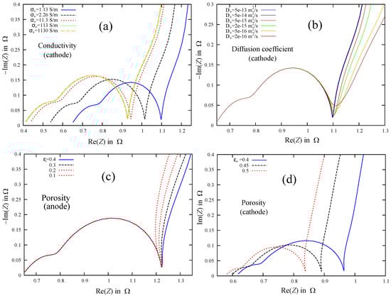 Nyquist diagrams for variations of electrode parameters: electronic conductivity in cathode (a), diffusion coefficient for ions in cathode particles (b), porosity of anode (c), and porosity of cathode (d).