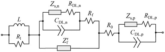 Assuming independent parallel flow of the charge current due to an electric double layer formation and intercalation current on the active material surface according to [46], after arranging the impedances of the electrodes, separator, and current collector, we arrive at the equivalent circuit shown in Figure 6. This circuit summarizes the popular LIB models (see, for example, [3,32]). Under certain simplifications, the equivalent circuit (EC) presented in Figure 6 can be reduced to the model considered in [3]. Our scheme is also consistent with the one proposed in [32]. However, Li et al. [32] introduced “by-hand” three CPE, substantiating them with the roughness of electrode particles and the fragmented SEI structure. Without denying the plausibility of these arguments, we only note that in our case, the circuit was fully derived within a methodologically-consistent model assuming subdiffusion in the electrolyte filling porous medium and in electrode particles.