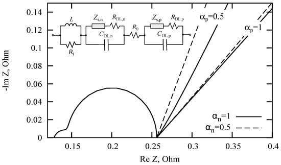 Consider the simplified circuit presented in Figure 7. The Nyquist diagrams are also presented for four pairs of subdiffusion index values : , , , and . For the other parameters: H, Ohm, F, F, Ohm, Ohm, Ohm. It can be seen from these diagrams that ion subdiffusions in the cathode and anode have a joint effect on the slope of the low-frequency section. Thus, the slope of this section cannot uniquely determine the subdiffusion indices and separately from each other.