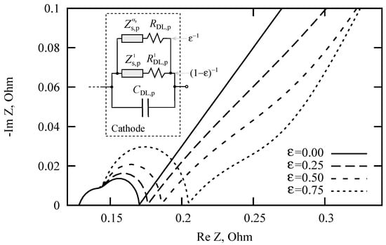 Adverse reactions and degradation processes can lead to a number of undesirable effects associated with the loss of LIB capacity. Usually, LIB aging occurs due to a variety of processes and reactions that simultaneously occur in different areas of LIB. A decrease in LIB capacity is often associated with processes occurring in a negative graphite electrode, where the formation of SEI film leads to an irreversible loss of cycled lithium, to an increase in internal resistance, and to a decrease in the pore volume available for the electrolyte. In our opinion, another additional factor is possible. It is associated with an increase in the fraction of particles, in which anomalous ion diffusion is predominant. The calculated discharge curves in galvanostatic mode (Figure 3 and Figure 4) indicate the plausibility of the hypothesis. An increase in the role of anomalous diffusion due to the disordering of the crystal lattice or the formation of an amorphous film can be estimated by introducing parallel-connected elements (see Figure 8, inset). Suppose that during the cycling, the fraction of particles characterized by anomalous diffusion of lithium in the solid phase increases. Let us choose the cathode as an example. The Nyquist diagrams for different values of are shown in Figure 8. The model parameters are the same as for Figure 7 with Ohm. The diffusion coefficients are taken from Table 1. Elements and are multiplied by and the elements and by . It can be seen from these diagrams that the slope of the rectilinear segment at low frequencies does not always unambiguously determine the subdiffusion index and can be both larger and smaller than the slope corresponding to normal diffusion.