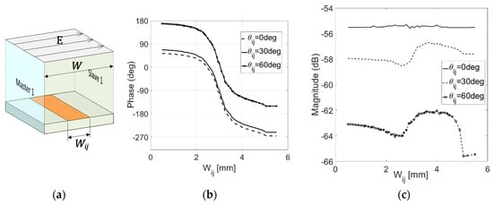 As it can be observed in Figure 2, fixing the inter-element spacing W to λ/3 (where λ is computed at 20 GHz), the phase of the reflected field can be fully controlled by varying the width of the strip. The relation between the incident and reflected field, evaluated at different angles of incidence θij, is then employed to design the reflectarray and to estimate its gain using Equations (1) and (3), respectively.