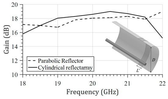 Cylindrical parabolic reflectors have been widely used in those applications requiring high gain antennas. Their design is dictated by the geometric relation of the parabola, which relate the feed location, f, to the radiating aperture, D. In this work, the use of reflectarrays is proposed to increase D without changing the feed location. In the proposed approach, the reflecting surface is loaded with dielectric panels where the phase of the reflected field is controlled using continuous metal strips of variable widths. This solution is enabled by the cylindrical symmetry and, with respect to rectangular patches or to other discrete antennas, it provides increased gain. The proposed concept has been evaluated by designing a Ka-band antenna operating in the Rx SatCom band (19–21 GHz). A prototype has been designed and the results compared with the ones of a parabolic cylindrical reflector using the same feed architecture. Simulated results have shown how this type of antenna can provide higher gain in comparison to the parabolic counterpart, reaching a radiation efficiency of 65%.