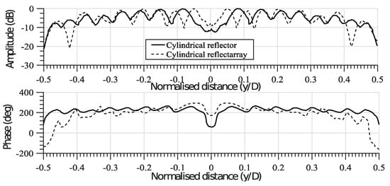 Comparison of field distribution (magnitude and phase) along the aperture of the parabolic cylindrical reflector and of the cylindrical reflectarray.