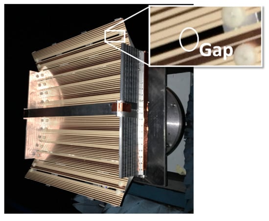 As shown in Figure 5, a prototype of the segmented reflectarray was realized. The 14 reflectarray panels (seven on each side of the reflector) were fixed to the feeding structure using two metallic support pairs. Unfortunately, some manufacturing errors occurred in the fabrication of these parts causing discontinuities and misalignment between the dielectric panels 5–7. These discrepancies, not symmetric in the two halves of the antenna, severely affected the radiation pattern as well as the radiation efficiency. In order to evaluate their impact on the antenna performance, a full-wave simulation reflecting the actual geometry of the antenna was performed. Considering that the PPW used in the prototype has an efficiency, , equal to 0.9, the expected gain of the whole structure could be computed as