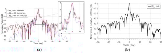 Figure 6 shows the simulated and measured radiation pattern of the whole structure at the center frequency (20 GHz). As it can be observed, the nominal simulated radiation pattern had a half-power beam width of about 2.8°. The manufacturing errors did not affect this parameter but they caused an increase of the radiation at low radiation angles as well as an asymmetry. The same figure shows the radiation pattern simulated with the unwanted gaps introduced by the aforementioned manufacturing errors. Good agreement between simulated and measured results were observed.