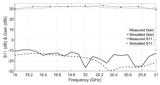 The measured gain and reflection coefficient vs. frequency are reported in Figure 7 along with the simulated curves. Simulations took into account the unwanted gaps. As it can be observed, the gain of the reflectarray (including the losses in the PPW) is higher than 31 dBi within the entire Ka Rx band (19–21 GHz) while return losses remain below 10 dB over a wider bandwidth. As expected, the gain bandwidth is limited by the narrow band effect of the reflectarray elements.