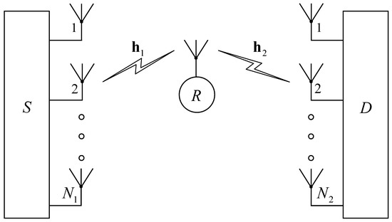Here, a dual-hop half-duplex DF cooperative relaying system is considered, as shown in Figure 1, where a single antenna relay R assists a source S with multiple antennas to communicate with a destination D with multiple antennas . It is assumed that the CSI is available at each node. The communication from S to D is possible only through node R, and the whole transmission of a wireless signal is completed in two consecutive phases. Node S uses the maximum-ratio transmission (MRT) technique and propagates wireless signals to node R during the first phase. At node R, the collected signals are first decoded and encoded, then forwarded to node D during the next phase. The maximal-ratio combining (MRC) technique is employed at node D to aggregate all the received signals from node R. Let the channel vectors, and , be from S to R and from R to D links, respectively.