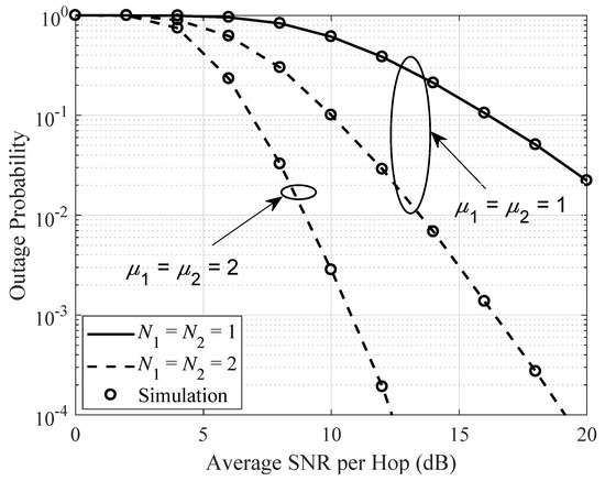Figure 2 shows the outage performance with respect to the average SNR per hop for various antenna numbers ( and ) and for different parameter values of (, ). Figure 2 confirms that the numerical results obtained from Equation (5) are perfectly consistent with the simulation results. The fading parameter and the number of antennas have a positive relationship with the system performance. Therefore, as expected, the system performance was improved with the fading parameter and the number of antennas.