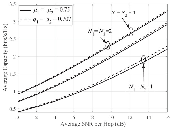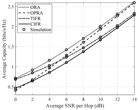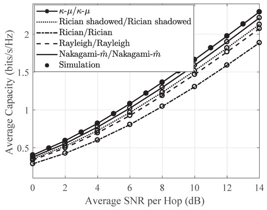 Figure 4 exhibits the average channel capacity of the OPRA technique against the average SNR per hop for the distinct channel models, viz., the Rician/Rician, κ–μ/κ–μ, Rayleigh/Rayleigh, Rician-shadowed/Rician-shadowed, and Nakagami-/Nakagami- fading links. As discussed before, the generalized κ–μ shadowed fading model contains these channel models as special cases, as listed in Table 2. Note that the parameter m is set as for non-shadowing environments, for shadowing environments, and the accuracy is confirmed through simulation. Furthermore, it is clear, from Figure 4, that κ–μ/κ–μ outperforms the other fading models, whereas the Rician/Rician shows the lowest performance, owing to shadowing.
