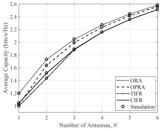 In Figure 5, the capacity performance is shown with respect to the number of antennas. We notice that the capacity performance increases with the increasing number of antennas at S and D nodes for all adaptive policies. It can also be seen that the ORA policy obtains a larger capacity, as compared to OPRA, when the number of antennas is low, but the performance gap between ORA and OPRA reduces with the increasing number of antennas. Additionally, a gap in the capacities of the TIFR and CIFR techniques is also observed with a lower number of antennas, but it is unnoticeable when the number of antennas is increased.