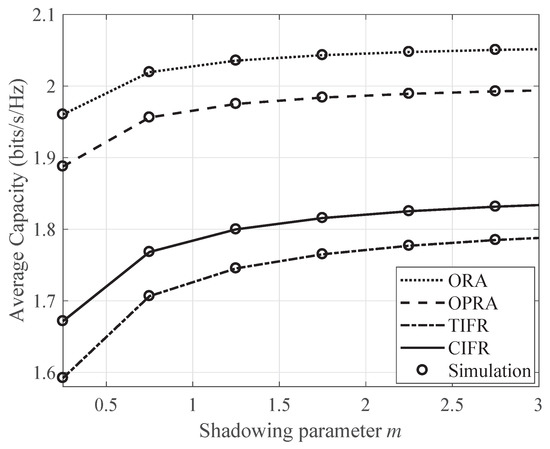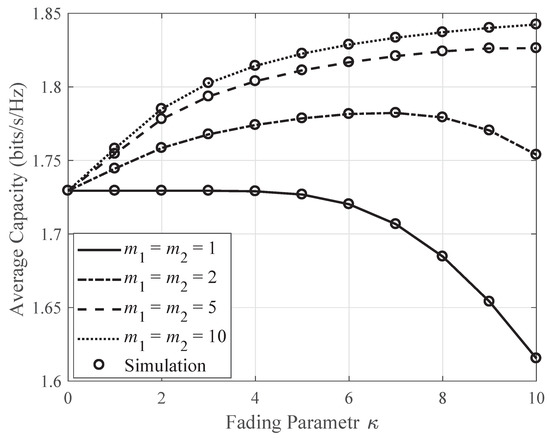 Figure 6 shows the average channel capacity for the parameter, , in the considered environment of κ–μ shadowed fading. It can be noticed that the capacity performance improves with the increasing value of the parameter m. The shadowing parameter m is the degree of fluctuation in the dominant component of the signal, owing to shadowing. For the larger parameter m, the power of the dominant component is more stable and thus causes less shadowing.