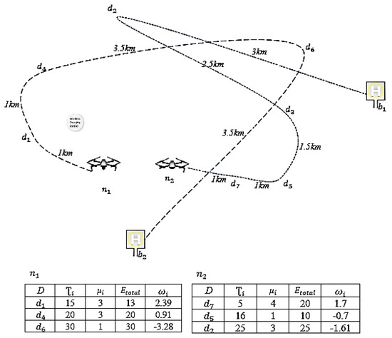 Now, let us consider the following scenario where drones and departed from and respectively. Figure 1 shows that is carrying a packet to be delivered in . However, is far away from the base and costs 3.5 km ( to ) + 3.5 km ( to ) flight to reach the base. Also, drone is carrying a packet to be delivered in that is far away from the base . As we see in Figure 2, when the summary of exchange packets in the pool is considered, the packet with destination that has the maximum weight is involved in TSP solver of both drones. The TSP outcome reveals that the delivery delay is smaller if the packet with destination is carried by . This is because has a shorter distance to . The next destination selection by drones is with the weight of 1.7, that due to the shorter distance to , it will be added to its route. By completing the selection process, we see that these drones only exchange two packets with destination and that results 2.5 km and 3.5 km less travel for drones and respectively.