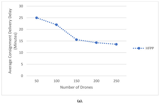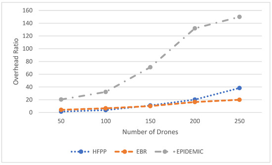 In terms of overhead, Figure 4 illustrates that HFPP has a low ratio, however, by increasing the number of nodes, the number of contact increases and the data packets will have more chance to be exchanged and become closer to the destination. Figure 5a shows that HFPP reduces the consignment delivery delay when the number of drones increases. This is because data packets will be quickly hosted at the best drone which is closer to the destination. Hence, drones will less likely modify their path frequently. This argument is proved by considering Figure 5b that shows in high node density, the average energy inefficiency sharply drops which is due to the establishing optimized path when data packets can be quickly hosted in the closest drone to the destination.