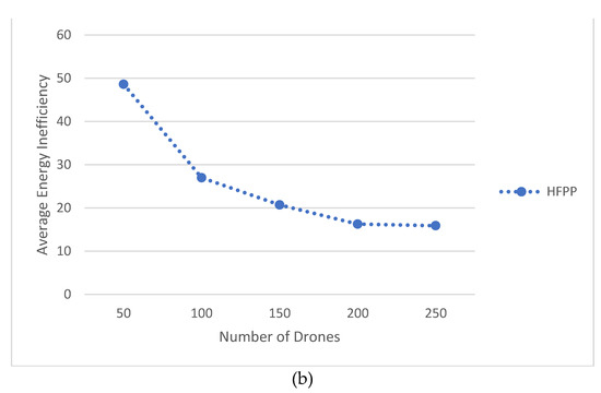 (a) Average consignment delivery delay, and (b) average energy inefficiency, of HFPP when number of drones varies.