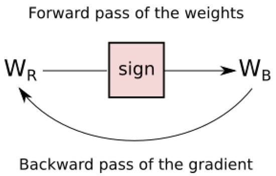 Calculating the gradient of the loss w.r.t. the real valued directly weights is meaningless due to the sign function used in binarization. The gradient of the sign function is 0 or undefined at every point. To get around this problem, Courbariaux et al. use a heuristic called the straight through estimator (STE) [24]. This method approximates a gradient by bypassing the gradient of the layer in question. The problematic gradient is simply turned into an identity function