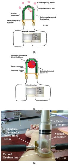 Concept of the proposed blood glucose measurement. (a) a straight dielectrically coated Goubau line; (b) a measurement setup for a curved Goubau line; (c) a measurement setup for the proposed blood glucose measurement; and (d) a photo showing how the cylindrical volume of a blood-filled skin tissue is formed using a vacuum suction aspirator.
