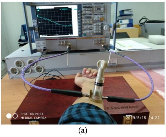 To validate the proposed concept, we conducted a series of in-vivo blood glucose measurements in the Vietnamese German University of Vietnam as well as the Chinese Academy of Sciences in China. In each in-vivo blood glucose measurement, a participant was guided by a nurse to undergo an invasive blood glucose measurement involving the use of a lancing device known as Accu Chek FlaxclixTM (Roche Diabetes Care, Inc., Indianapolis, IN, United States) at a particular time of the day. Within 15 m after this invasive blood glucose measurement, the participant was guided through a non-invasive blood glucose measurement on both left and right hands using the proposed method as illustrated in Figure 1c. The network analyzer used in this work was ZVA45B manufactured by Rohde & Schwarz R&S (in Mühldorfstraße 15, 81671 Munich Germany). During the measurements, the participants were allowed to move their body violently. Figure 2a shows the photograph of the actual setup for each non-invasive blood glucose measurement.
